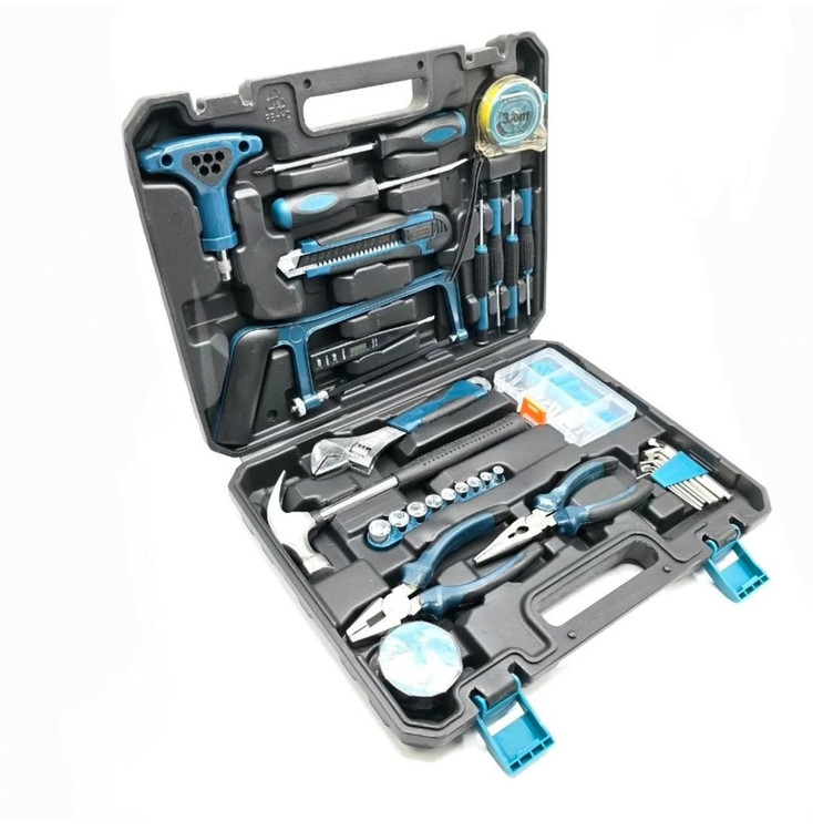 آچار فرانسه سایز ۸، انبردست، دمباریک، چراغ قوه LED، چکش با میخ کش، مجموعه هشت عددی آچار آلن، کاتر سایز بزرگ روکش دار، بکس تک سایز ۴ تا ۱۳، متر ۳ متری روکش دار، پیچ گوشتی دوسو و چهارسو سایز بزرگ، چهار عدد پیچ گوشتی سایز ریز دو سو و چهار سو، دسته پیچ گوشتی T نوک خوربکسی، ۹ عدد نوک پیچ گوشتی، تبدیل نوک پیچ گوشتی به بکس چسب برق، فازمتر دیجیتال، دو سایز پیچ گوشتی موبایلی دو سو و دو سایز پیچ گوشتی موبایلی چهارسو، کمان اره چوب و فلز، مجموعه سایزبندی پیچ و رولپلاک