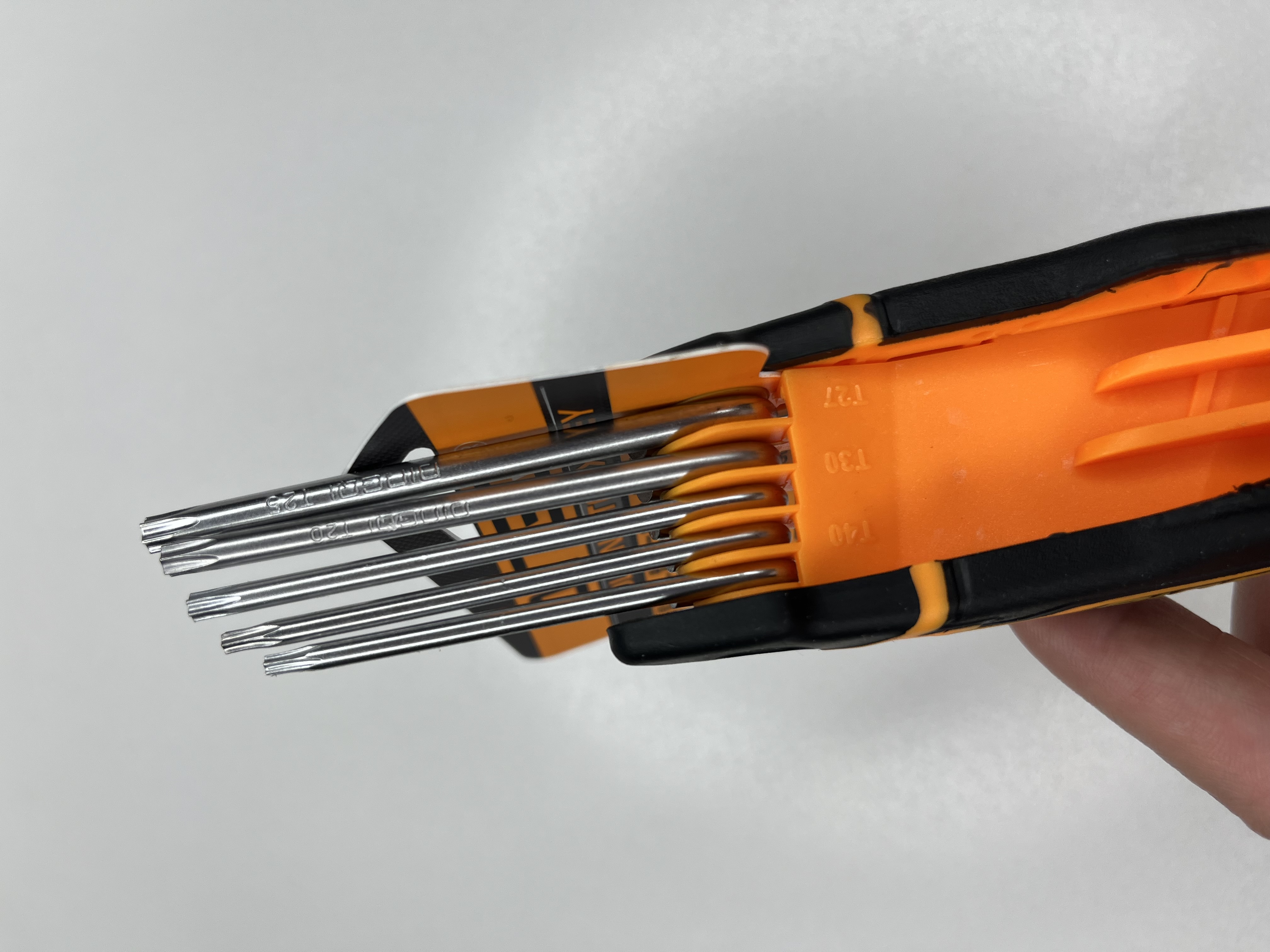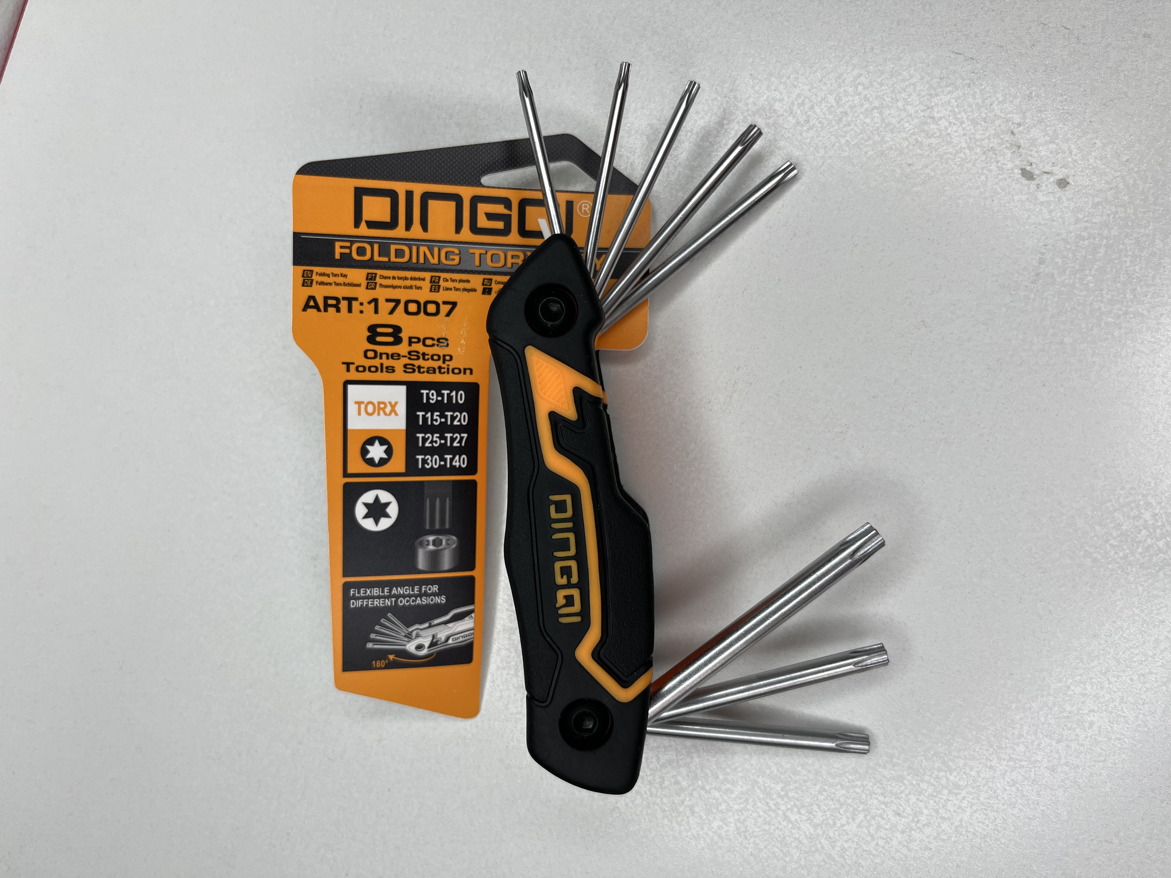 ست حرفهای آچار تاشو شامل ۸ سر ستارهای (T۱۰، T۱۵، T۲۰، T۲۵، T۲۷، T۳۰) با قابلیت چرخش ۱۸۰ درجه. ایدهآل برای تعمیرات فنی، الکترونیک و مبلمان.